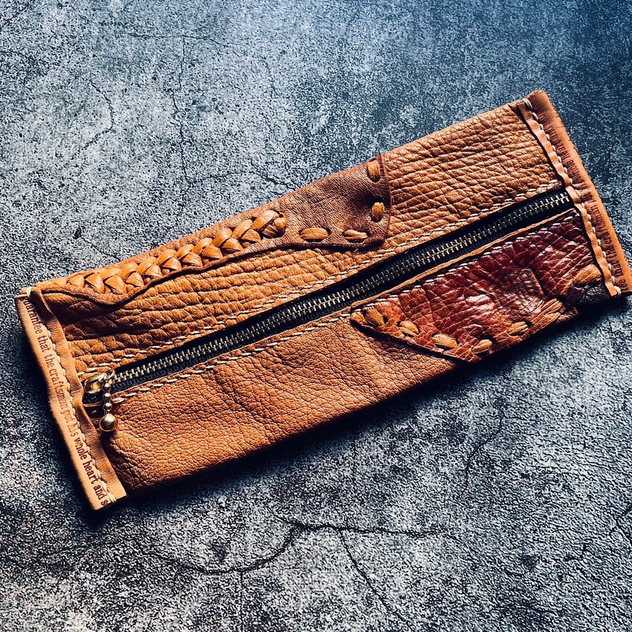 鹿革を組み合わせた芸術的な作品のペンケースです。